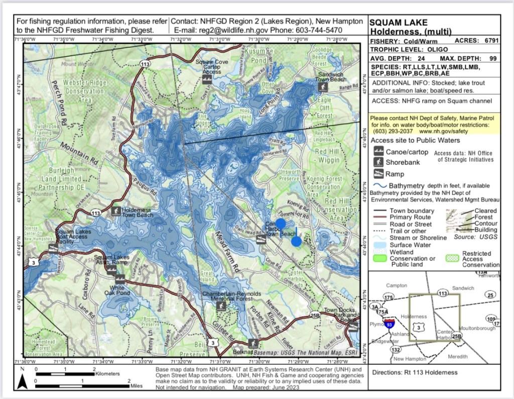 The facts and statistics of Squam Lake are easily found. According to New Hampshire Fish and Game, Big Squam is 6701 acres of surface water with an average depth of 24 feet and a max depth of 99 feet. Because Big and Little Squam are only separated by a navigable channel in Holderness, you can add Little Squam’s 454 acres and see that functionally, Squam Lake is over 7,000 acres, easily the second largest lake in New Hampshire trailing only the massive Winnipesaukee. The lake(s) stretch from the incredibly picturesque town of Sandwich in the northeast all the way to Ashland, where it empties into the Squam River, itself navigable for a healthy stretch, meandering through downtown Ashland, before finally emptying into the Pemigewasset River on its way to the Atlantic. Other towns that have shorefront on Squam are Center Harbor and Moultonborough.